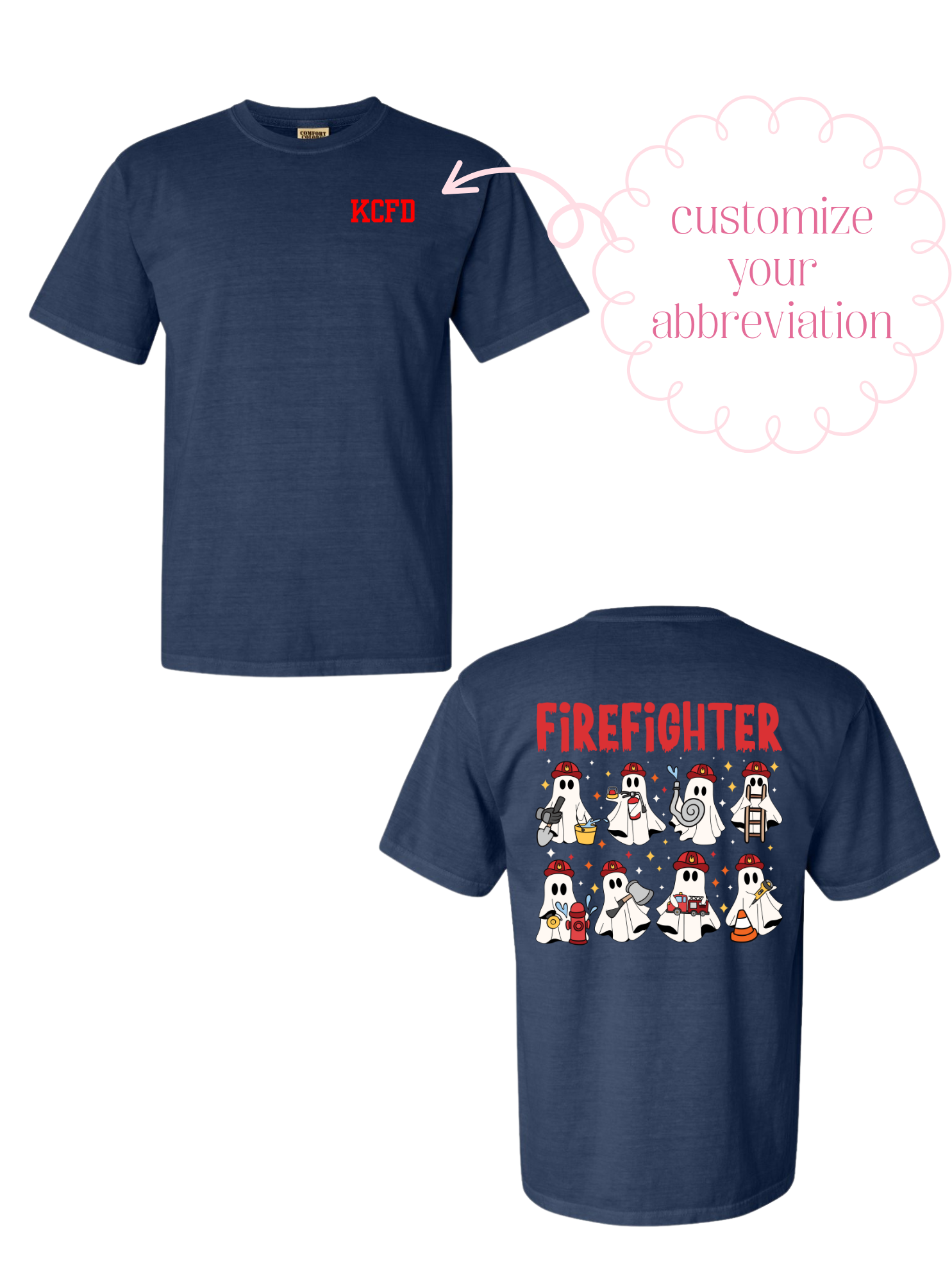 Show your firefighting spirit with this playful tee featuring heat-pressed cartoon firefighter ghosts. Customize it by choosing your department abbreviationālike KCK or KCFDāto make it truly yours. Soft, comfortable, and full of character, this tee is perfect for those who want to add a touch of fun to their firehouse style.